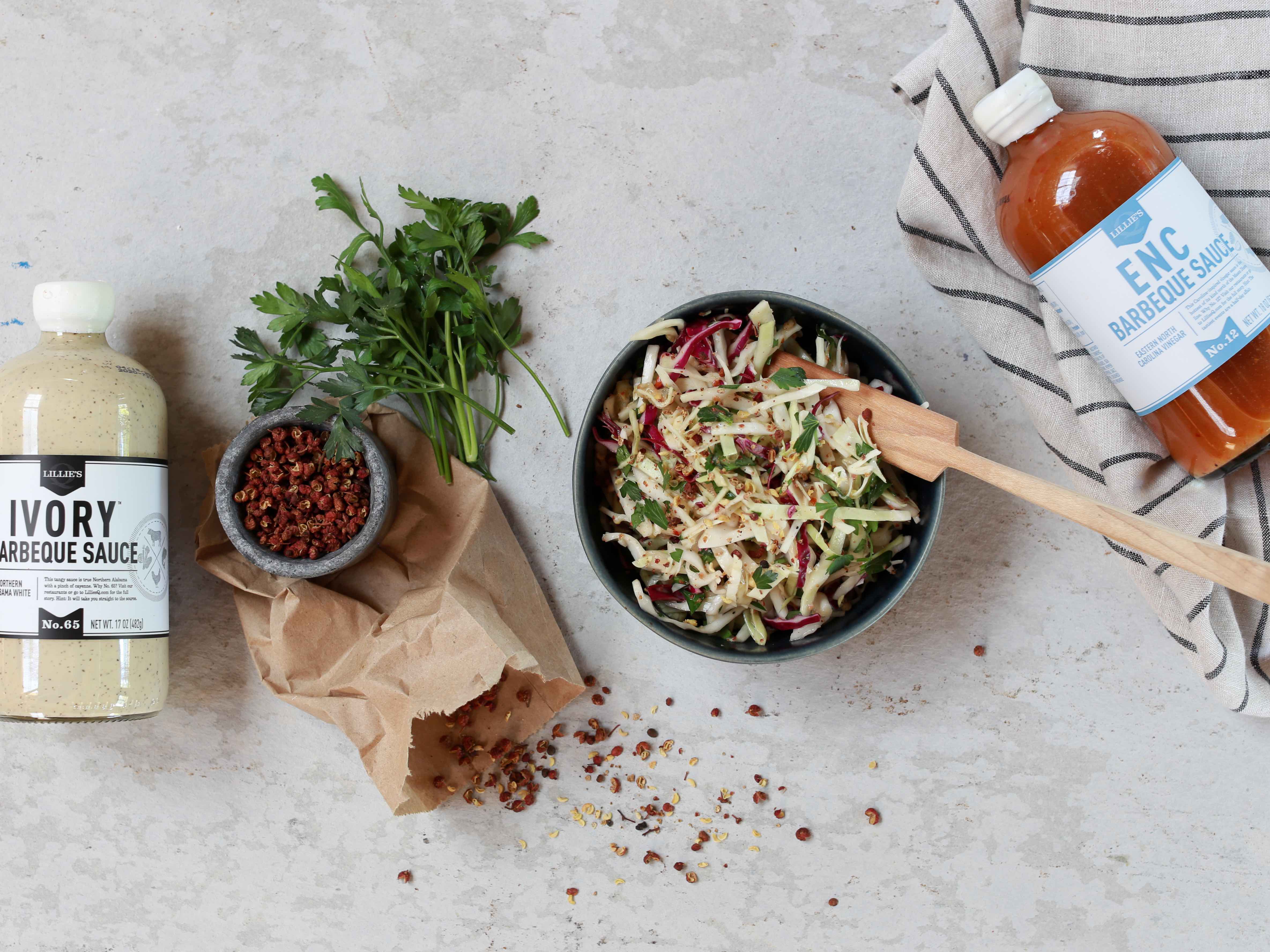 Alabama White Sauce, what we call Ivory, is a mayonnaise (preferably Duke’s) and vinegar based barbeque sauce with salt, pepper, and garlic. Similar to a coleslaw dressing, this sauce sometimes has a little cayenne or horseradish for an extra kick of flavor.